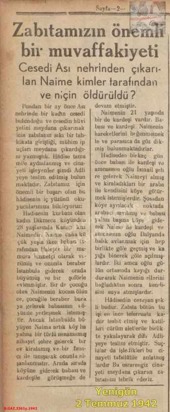 Antakya’da Cinayet – Yenigün – 2 Temmuz 1942