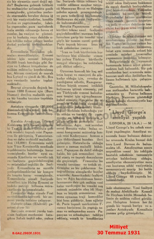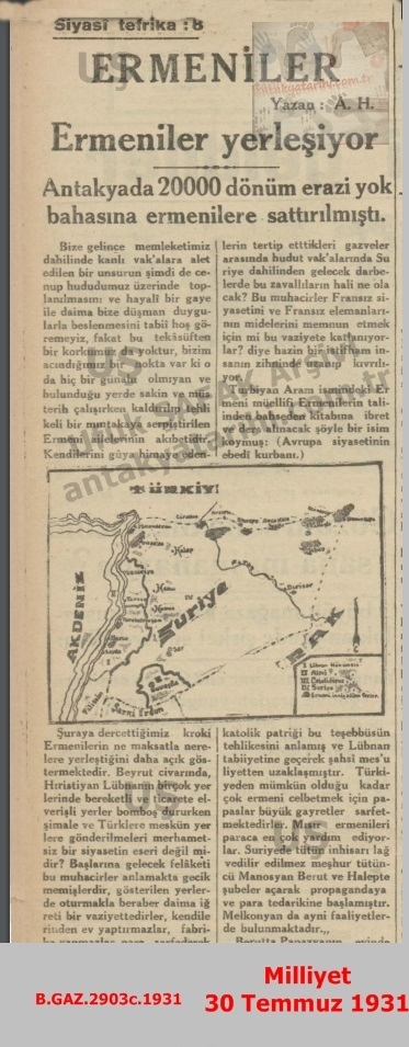 Antakya’da Ermenilerin Arazi Satın Aldığı ve Abdülkadir Kemali – Milliyet 30 Temmuz 1931/Land Purchases by Armenians in Antakya and Abdülkadir Kemali – Milliyet Newspaper, July 30, 1931