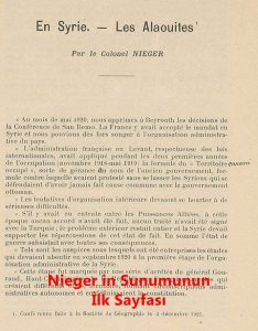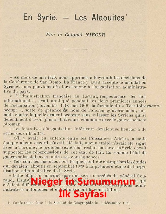 Nieger’in sunumunun tam metni bu şekilde. Metni ikiye bölmek mümkün. Birincisi Suriye’nin genel siyasi, sosyal durumu ve Fransa’nın buradaki sömürgeci bakış açısı. İkincisi Arap Alevilerle ilgili bilgiler ve değerlendirmeler. Metni çevirirken bazı anlatımlar 1650 yılında bölgeyi gezen Evliya Çelebinin Alevilerle ilgili yazdıklarını hatırlatıyor. Bazı bölümlerdeki anlatılarda Halep Valisi Cevdet Paşa’nın Alevilerle ilgili yazdığı ön yargıların izlerini taşıyor.