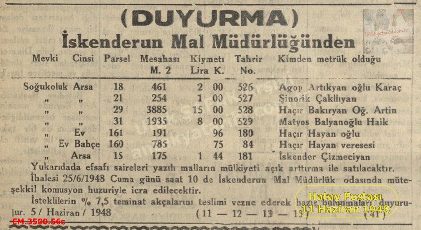 Soğukoluk’taki Ermeni Arazileri Satılıyor-Hatay Postası-11 Haziran 1948/Armenian Lands in Soğukoluk Being Sold – Hatay Post – June 11, 1948
