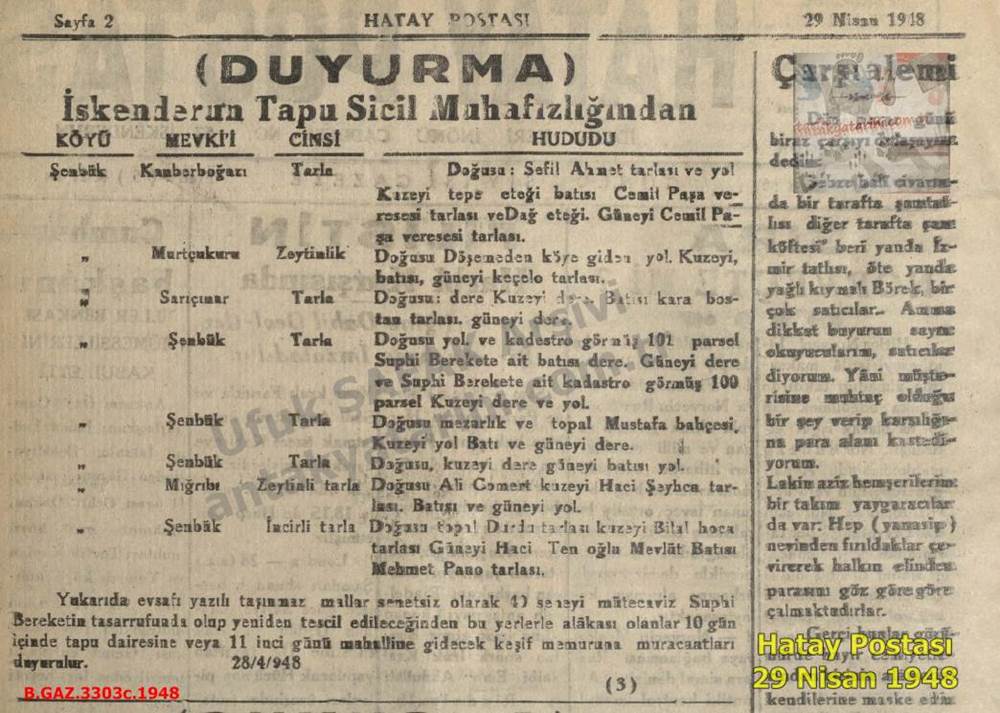 Suphi Bereketi Ait Taşınmazlar- 29 Nisan 1948 Hatay Postası