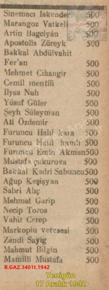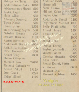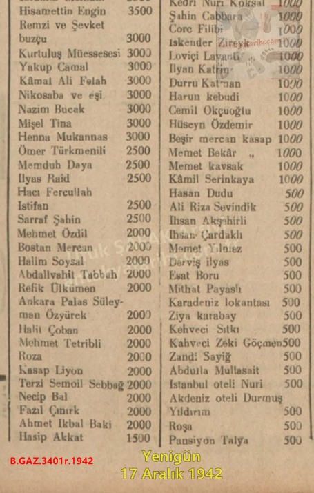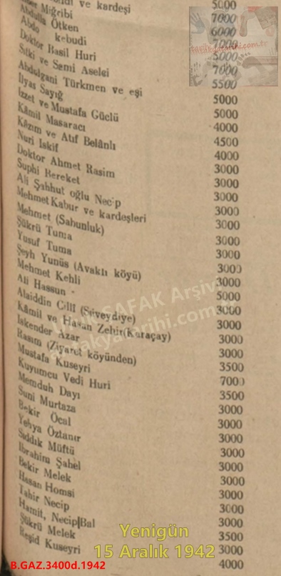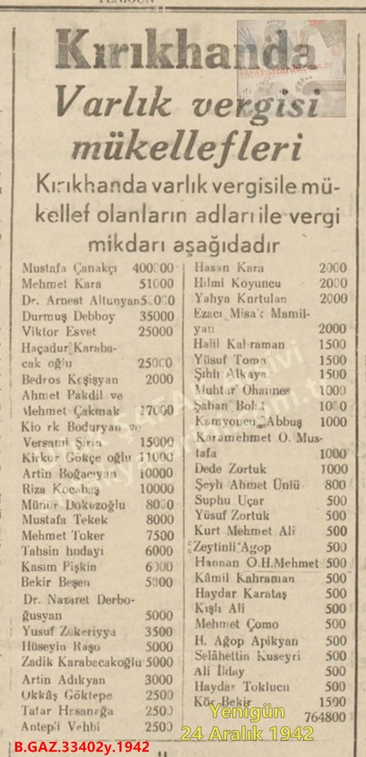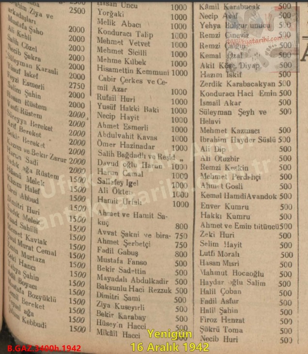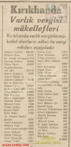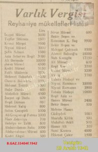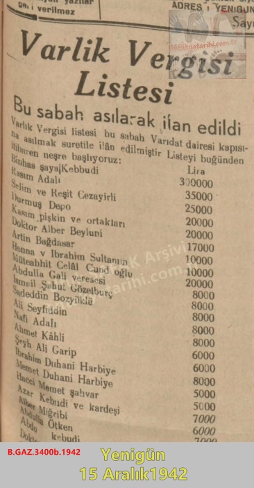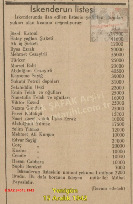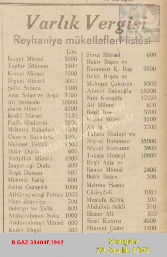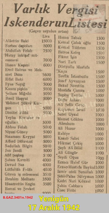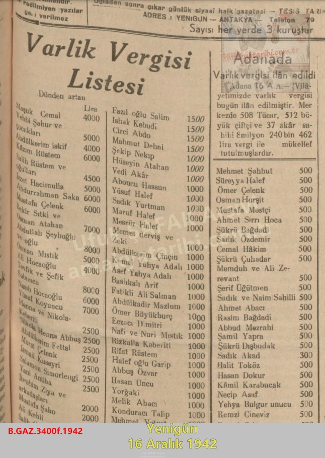 Varlık Vergisi Listesi Antakya ve İskenderun Yenigün Aralık 1942/Wealth Tax Antakya and Iskenderun List-Yenigün Newspaper December 1942